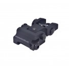 PRI's flip up rear sight is constructed of T6 6061 hard coated Black anodized aluminum. This sight is designed to work on a same plane aperture system that allows the operator to choose between 2 different setting without loosing zero. The low profile sight will allow the use of optics and top rails. The sight lifts and locks in the up position and to lower you need to push the detent button. The sight also has a side windage adjustment. From the base to the peep is 1.4" and weighs 2.4 ounces.