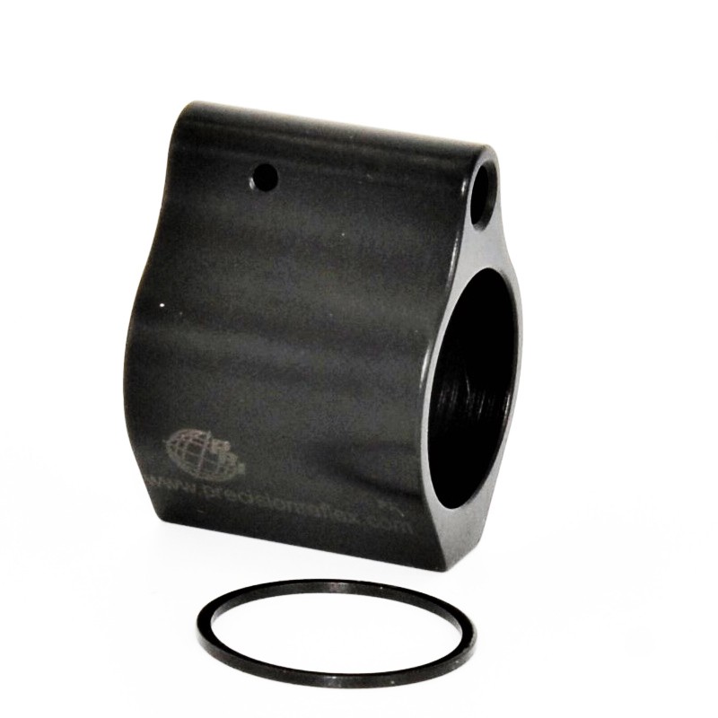 The low profile gas block for .750 diameter barrel is constructed of 1141 high strength steel with a nitrite finish. The gas block is held in place by 2 10-32 set screws. The gas block is 1.38" tall 1" in length and is .625" from bore center to gas tube. Block is .920 in width and comes with a roll pin. From the back of the gas block to the gas port hole is .250. This leaves .035 between the back of the gas block and most steps in the barrel. This is for installing of the A2 style hand guards. So there should be a .035 gap between the barrel step and the gas block. This can be filled with spacer or leave empty.