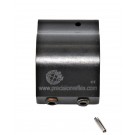 The low profile gas block for .875 diameter barrel is constructed of 1141 high strength steel with a Nitrite finish. The gas block is held in place by 2 10-32 set screws. The block is 1.423" tall 1" in length and is .625" from bore center to gas tube. It is 1.025 in width and comes with a roll pin. From the back of the gas block to the gas port hole is .250. This leaves .035 between the back of the gas block and most steps in the barrel. This is for installing of the A2 style hand guards. So there should be a .035 gap between the barrel step and the gas block. This can be filled with spacer or leave empty.