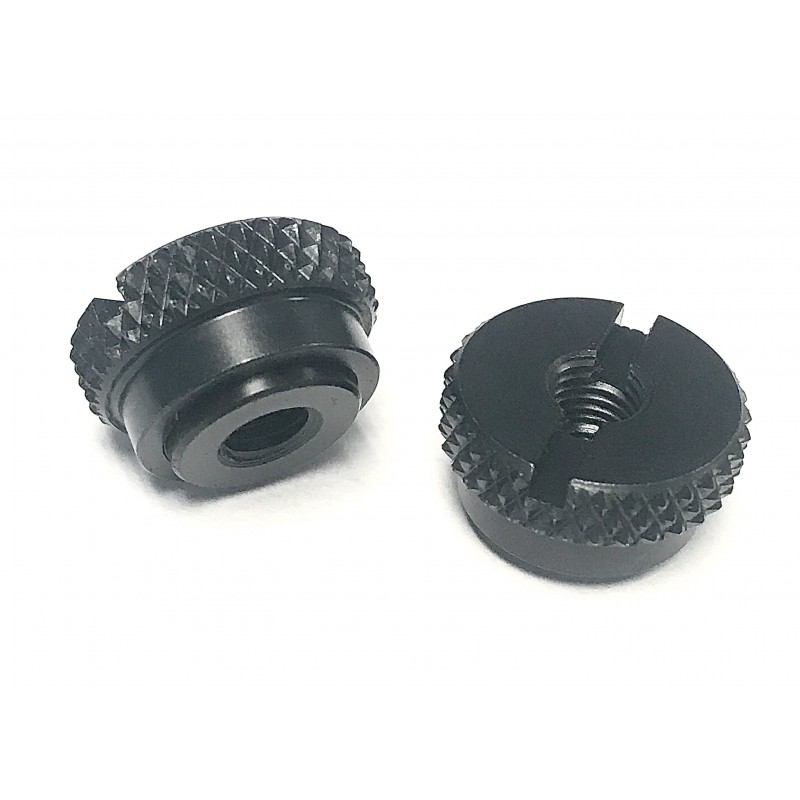 Replacement Thumb Wheel nuts with nylon bushing. Set of 2 for cantilever mounts. Thread is 1/4-28 with a nylon washer. Nitrite finish.